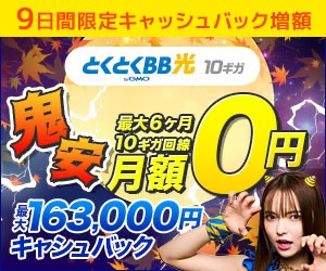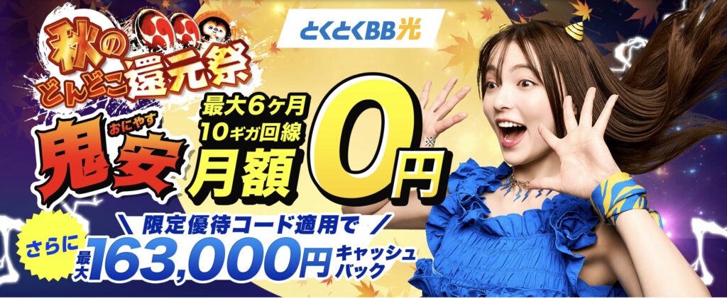 「とくとくBB光」は最大6ヶ月間月額0円、最大163,000円のキャッシュバックがもらえます!